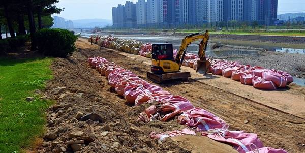 특히 가장 큰 피해가 발생한 우방아파트 쪽의 제방이 낮았다. 제방이 유실되어 임시방편으로 모래주머니를 쌓아 올리는 공사 중이었다. 넘쳐흐른 빗물에 무너진 아파트 울타리는 아파트로 밀려든 그날의 물길이 얼마나 거셌는지 짐작케 했다.