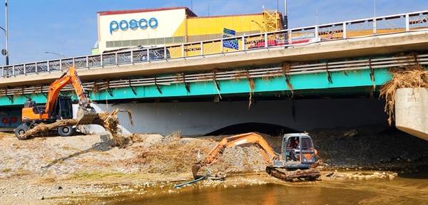 | ▲ 냉천교 아래 걸린 나뭇가지들을 중장비들이 끄집어 내고 있다. 냉천교는 물길이 통하는 다리가 아니라 물길을 막는 댐이었다. |