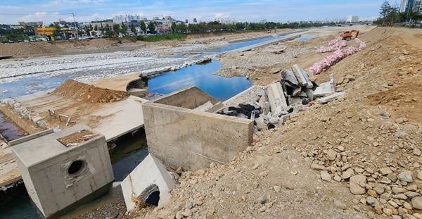 | ▲ 좁은 하천에 수많은 시설을 설치했다. 이번 홍수에 처참히 망가졌다. |