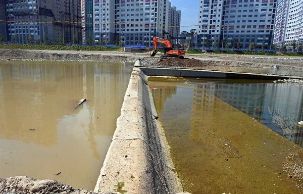 성토한 산책로 위에 올라섰다. 차가 오가는 제방 밖의 도로와 높이 차이가 겨우 1m에 불과했다. 침수 피해를 입은 아파트 방향의 수면 쪽으로 내려갔다. 사람 키 높이보다 더 높은 2m 이상의 제방을 쌓아 올렸다.