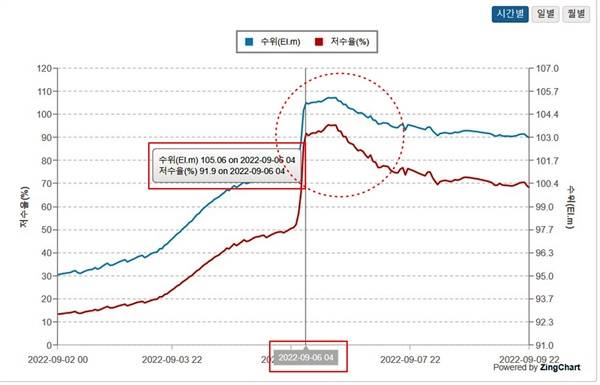 농촌용수종합정보시스템에서 오어저수지의 시간대별 수위 그래프를 보자. 9월 6일 새벽 0시부터 새벽 4시까지 급격하게 수위가 올라 거의 만수위에 도달했다. 그러나 새벽 4시부터 수위가 완만하게 유지됐다. 강수량 데이터에 따르면 6일 새벽 4시 이후인 6시~7시 사이에 큰 비가 쏟아졌다.