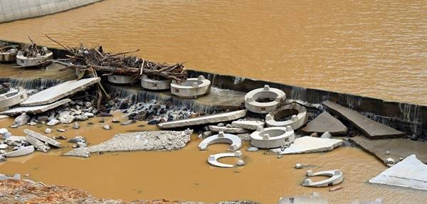 | ▲ 물길 양쪽에 또 다른 제방을 쌓아 빗물이 빠르게 흘러 홍수 피해를 가중시켰다. 결국 이번 비에 처참히 망가졌다. |