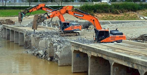 | ▲ 포항시가 냉천의 빗물 흐름을 막는 잠수교를 철거하고 있다. 이처럼 냉천의 홍수를 에방하는 방법은 간단하다. 홍수를 유발하는 요인을 제거하는 것이다. 고향의 강 정비사업으로 설치한 시설들과 냉천교를 철거하면 냉천은 안전한 하천이 될 것이다. |