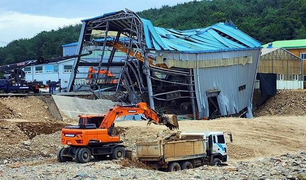 | ▲ 거센 빗물에 제방이 무너져 바닥 콘크리트가 유실되면서 공장이 붕괴했다. |
