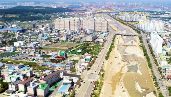| ▲ 냉천이 좌측으로 살짝 휘어지는 물길 정면에 침수 사고가 발생한 아파트가 있다. |