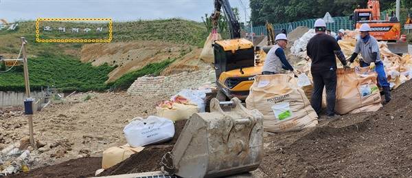 | ▲ 오어저수지 여수로 맞은 편 둑이 유실되어 자루를 쌓아 올리는 긴급 공사가 진행되고 있었다. |