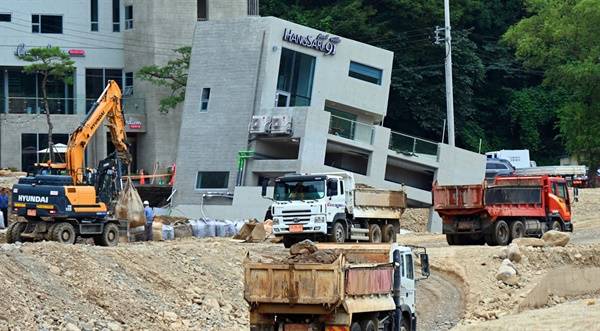 | ▲ 불어난 빗물에 제방이 붕괴해 물이 밀려들면서 지반이 약해져 신축 빌라가 기울어졌다. |