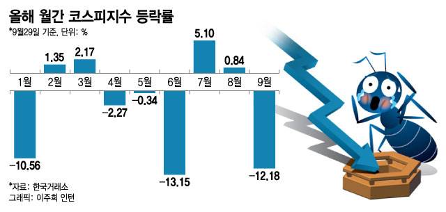 앞서 코스피지수는 올해 1월(-10.56%)과 6월(-13.15%)에도 10% 이상 떨어졌다. 올해 들어 코스피 월별 등락률이 -10% 이상인 경우가 벌써 세 차례나 되는 셈이다.