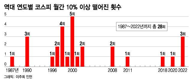 2022년은 한국거래소가 통계를 집계하기 시작한 1987년 이후 월별 10% 이상의 하락률이 세번째로 많이 나온 해가 된다. 지난 36년간 월별 코스피 하락률이 10%를 넘겼던 경우는 총 28회다.