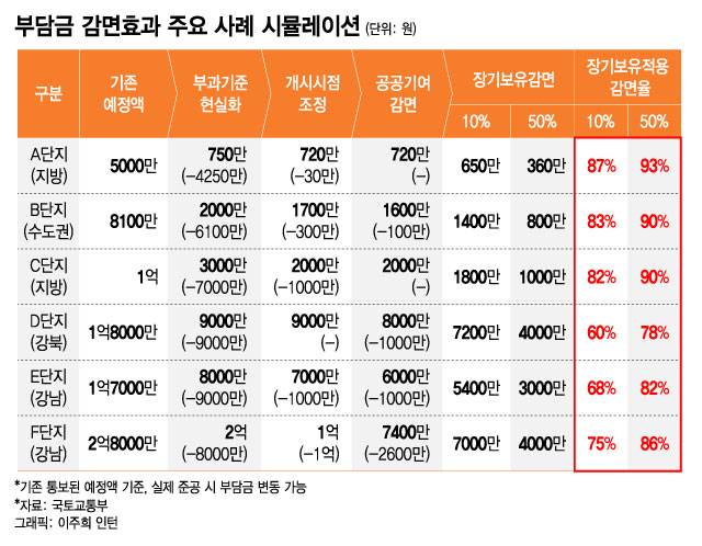 당초 4억원의 부담금을 통보받은 성수동 장미아파트도 개선안에 따라 부담금이 8500만원(약 21%) 줄어 3억1500만원이 된다. 10년 장기보유자는 최종적으로 61%가 줄어 1억5800만원을 부담하게 된다. 이 단지에선 주택 보유 기간에 따라 조합원별로 최소 29%에서 61%까지 부담금 최종 감면율이 달라진다.
