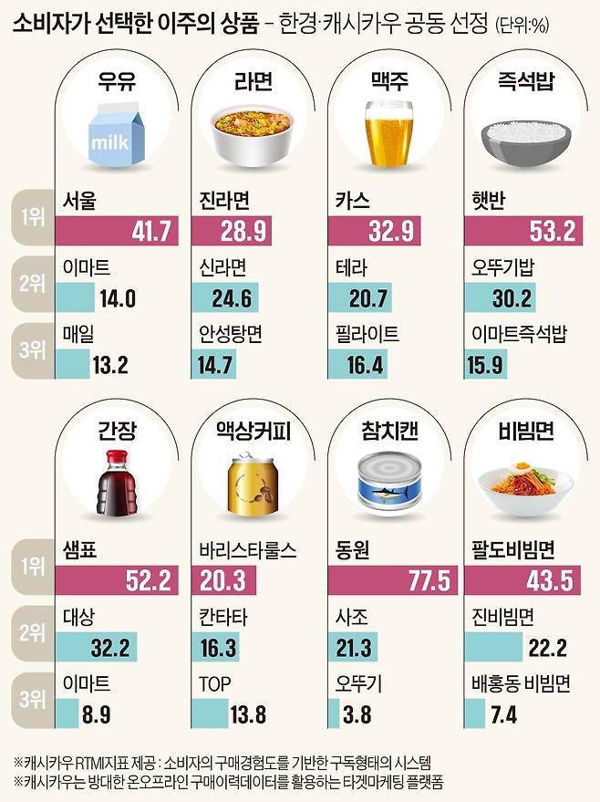 편의점 컵·캔커피로 불리는 ‘RTD(ready to drink) 커피’ 시장에서는 매주 순위가 바뀌며 혼전이 계속되고 있다. 1위 바리스타룰스(20.3%)에 이어 칸타타(16.3%), TOP(13.8%)가 경쟁하는 모습이다. 우유 시장에서는 서울우유가 구매경험도 41.7%를 기록하며 경쟁사를 크게 따돌렸다. 이마트PB(14%), 매일유업(13.2%)이 2위와 3위에 각각 올랐다.