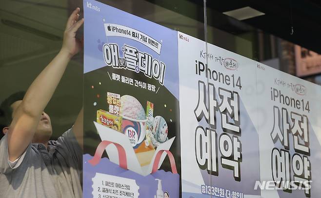 [서울=뉴시스] 김금보 기자 = 애플의 신제품 아이폰14 시리즈 국내 사전예약이 시작된 30일 오전 서울 중구 한 통신사 매장에서 직원이 홍보 포스터를 게시하고 있다. 2022.09.30. kgb@newsis.com