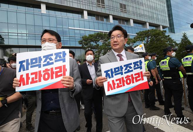 | ▲ 권성동 전 원내대표 등 국민의힘 의원들이 28일 오전 서울 마포구 문화방송 본사 앞에서 윤석열 대통령 해외 순방 보도와 관련해 항의 방문한 뒤 돌아 나오고 있다. |