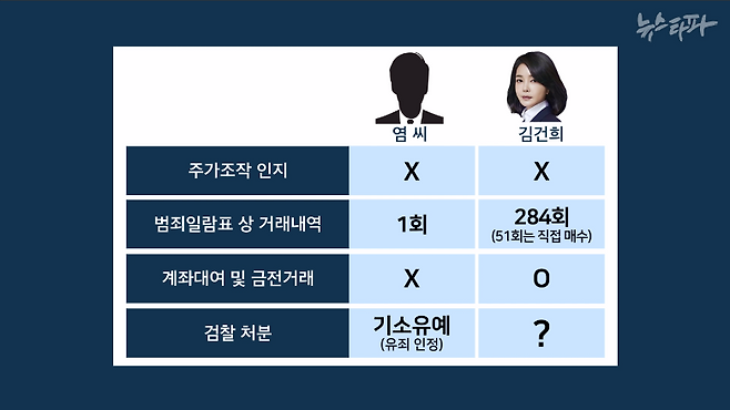 염 씨의 혐의와 김건희 여사의 혐의를 비교해보자. 김건희 여사는 염 씨와 달리 주가조작 작전 기간 동안 수백 차례의 거래를 통해 도이치모터스 주식을 사고 팔았다. 범죄일람표에는 김건희 여사 계좌로 이루어진 거래가 284건이나 나온다. 그 가운데 적어도 51건은 뉴스타파가 녹취록을 보도한 대로, 김건희 여사와 증권사 직원과의 통화가 있었던 2010년 1월 12일, 김 여사 스스로 거래한 것이다. 이 외에도 김건희 여사는 자신의 계좌를 1차와 2차 작전 시기 모두에 걸쳐 주가조작세력에게 맡겼다. 액수는 특정되지 않았지만 1차 작전 세력과도 돈 거래가 있었고, 2차 작전 세력과는 15억 원의 돈 거래를 했다.