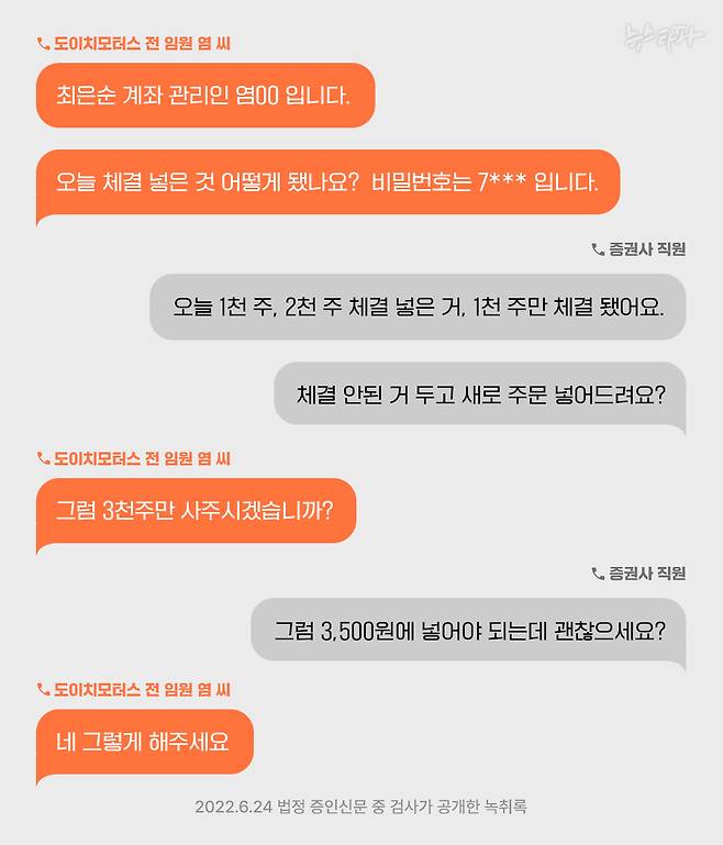 도이치모터스 임원 염 씨가 PC나 휴대전화 뿐 아니라 최은순 계좌의 관리인으로서 증권사에 전화 주문도 넣었음을 입증하는 녹취록이다. 그런데 염 씨는 최은순 씨와 직접 만나거나 연락을 한 적이 없으며 누구의 어머니인지도 알지 못했다고 말했다. 따라서 염 씨를 최은순 씨 계좌의 대리인으로 지정한 것과 최 씨 계좌의 비밀번호를 알려준 것은 모두 권오수 회장이라는 것이다.