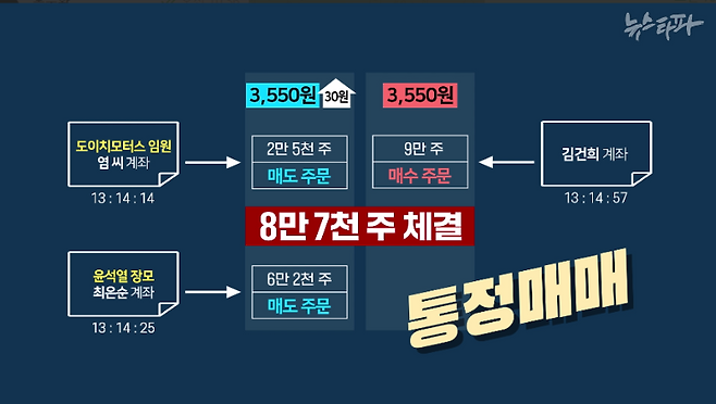 그런데 그로부터 32초 뒤인 1시 14분 57초, 김건희 여사의 계좌에서는 9만 주를 매수하는 주문을 넣었다. 매수 호가는 정확히 3,550원이었다. 그 결과 염 씨와 최 씨 계좌에서 내놓은 매도 물량 87,326주를 모두 김건희 계좌가 매수하게 됐다. 거래가 체결되면서 주가는 3,550원으로 뛰었다. 검찰은 이 거래를 서로 짜고 치는 거래, 즉 통정 거래로 보고 범죄일람표에 포함시킨 바 있다.