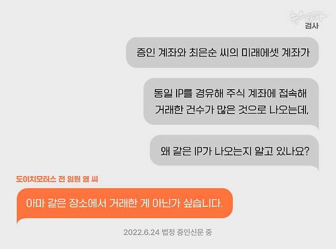 이날 증인 신문에서는 최은순 씨 및 염 씨 계좌와 김건희 여사 계좌 사이의 이상 거래에 대한 질문도 나왔다. 2010년 11월 3일, 염 씨 계좌는 1시 14분 14초에 25,007주를 매도하는 주문을 냈고, 같은 IP를 경유한 최은순 씨 계좌는 11초 뒤인 오후 1시 14분 25초에 62,319주를 매도하는 주문을 냈다. 매도 호가는 똑같이 3,550원이었다. 그런데 당시 다른 사람들이 제시한 매수 호가 중 가장 높은 가격은 3,520원에 불과했다. 제시된 매수 가격보다 30원, 호가상으로 6단계나 높은 가격에 주식을 내놓은 것이다.