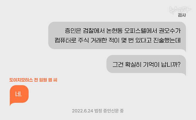 지난 6월 24일 열린 도이치모터스 주가조작 사건 재판에서, 도이치모터스의 CFO, 즉 최고재무책임자였던 염 모 씨의 증인 신문이 있었다. 검사는 염 씨에게 다음과 같이 물었다.