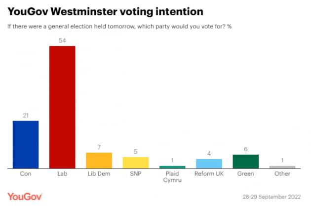 29일(현지시간) 영국 일간지인 가디언은 “여론조사기관 유고브가 28~29일 실시한 설문조사에 따르면 영국 노동당의 지지율이 54%를 기록해 보수당(21%)을 33%포인트 앞섰다”고 발표했다. 이렇게나 지지율 격차가 벌어진 건 토니 블레어 총리 시절인 1990년대 후반 이후 처음이다.