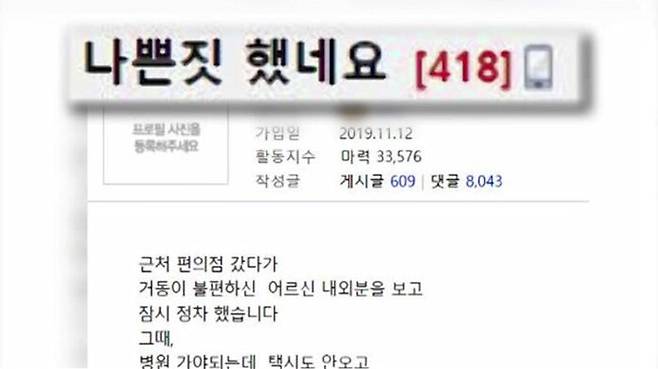 어제(29일) 한 온라인 커뮤니티에 '나쁜 짓 했네요'라는 제목의 글이 올라왔습니다.