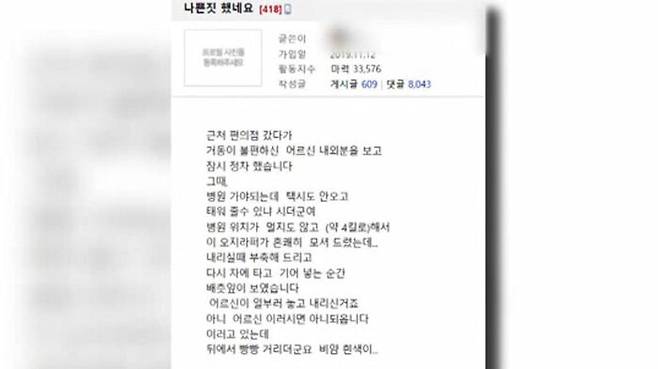 글쓴이 A 씨는 근처 편의점에 들렀다가 거동이 불편한 노부부를 보고 잠시 정차했는데, 노부부는 A 씨에게 "병원에 가야 하는데 택시가 안 온다"면서 "혹시 태워줄 수 있냐"고 물었다고 합니다.