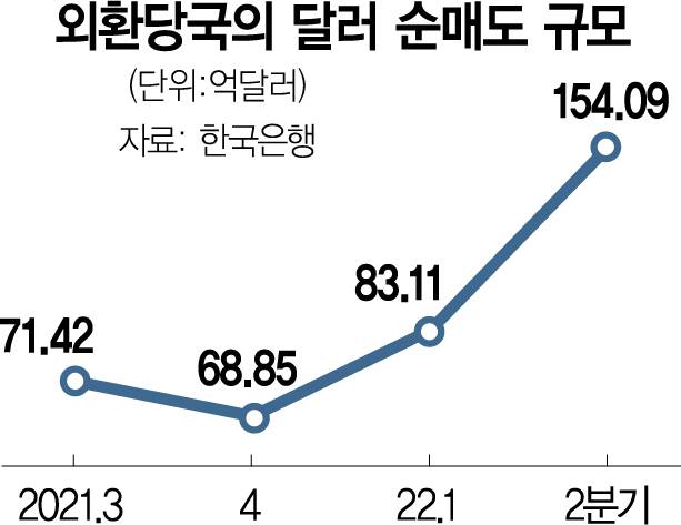 외환 당국이 널뛰는 원·달러 환율 변동성을 줄이는 과정에서 올해 상반기에만 외환시장에서 154억 900만 달러를 팔아치웠다. 외환시장 개입 내역을 공개하기 시작한 2019년 3분기 이후 최대 규모다.
