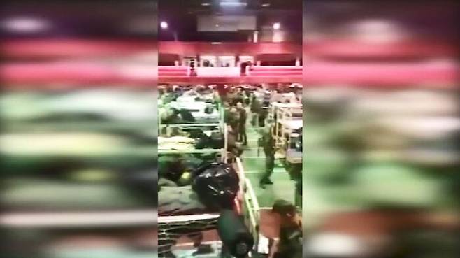 체육관으로 보이는 공간에 성인 한 명이 간신히 누울 수 있는 크기의 2층 침대가 빼곡하게 들어서 있습니다.