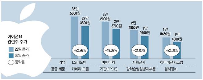 30일 한국거래소에 따르면 아이폰14에 카메라 모듈을 공급하는 LG이노텍 주가는 전일 대비 0.55% 내린 27만3500원에 장을 마감했다. LG이노텍은 지난 23일부터 6거래일 연속 하락세를 이어가며 지난 22일 종가 대비 22.96% 빠졌다. 지난 28일에는 하루 만에 10.50% 급락하기도 했다. 아이폰14에 연성회로기판(FPCB)을 공급하는 비에이치 주가도 2만5700원으로 전일 대비 4.46% 급락했다.