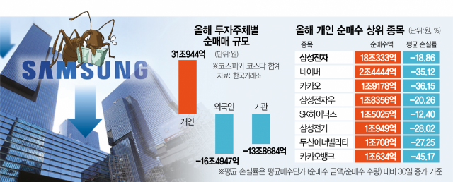 개미들의 투자 바구니에서 가장 많은 비중을 차지하는 종목은 삼성전자다. 개인은 삼성전자를 18조 333억 원 순매수했다. 삼성전자우(1조 8356억 원)를 포함하면 20조 원 가까이 사들인 것이다. 코스피와 코스닥 시장의 순매수액 31조 1944억 원 중 63.69%를 차지한다.