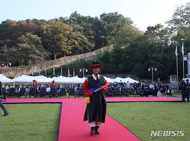 [고창=뉴시스] 김종효 기자 = 30일 전북 고창군의 대표축제인 '제49회 모양성제'가 개막했다. '모양성 축성 고을기 올림행사'에서 고창군 고을기 올람 순서에 맞춰 심덕섭 고창군수가 게양대 앞으로 향하고 있다. 2022.09.30. kjh6685@newsis.com