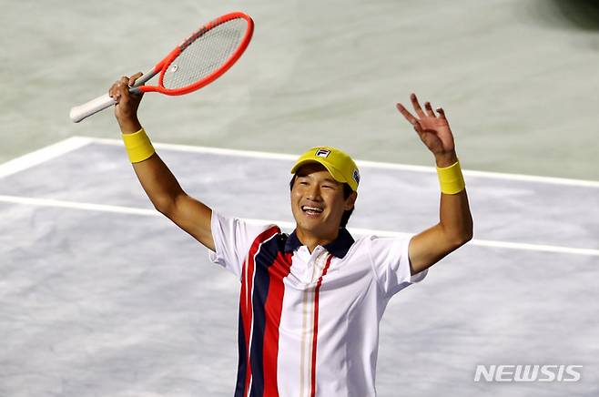[서울=뉴시스] 추상철 기자 = 30일 오후 서울 송파구 올림픽공원 테니스경기장에서 열린 남자프로테니스(ATP) 투어 '유진투자증권 코리아오픈 테니스대회' 복식 8강 경기. 권순우가 안드레 예란손(스웨덴)-벤 매클라클런(일본) 조를 상대로 승리를 거둔 후 기뻐하고 있다. 2022.09.30. scchoo@newsis.com