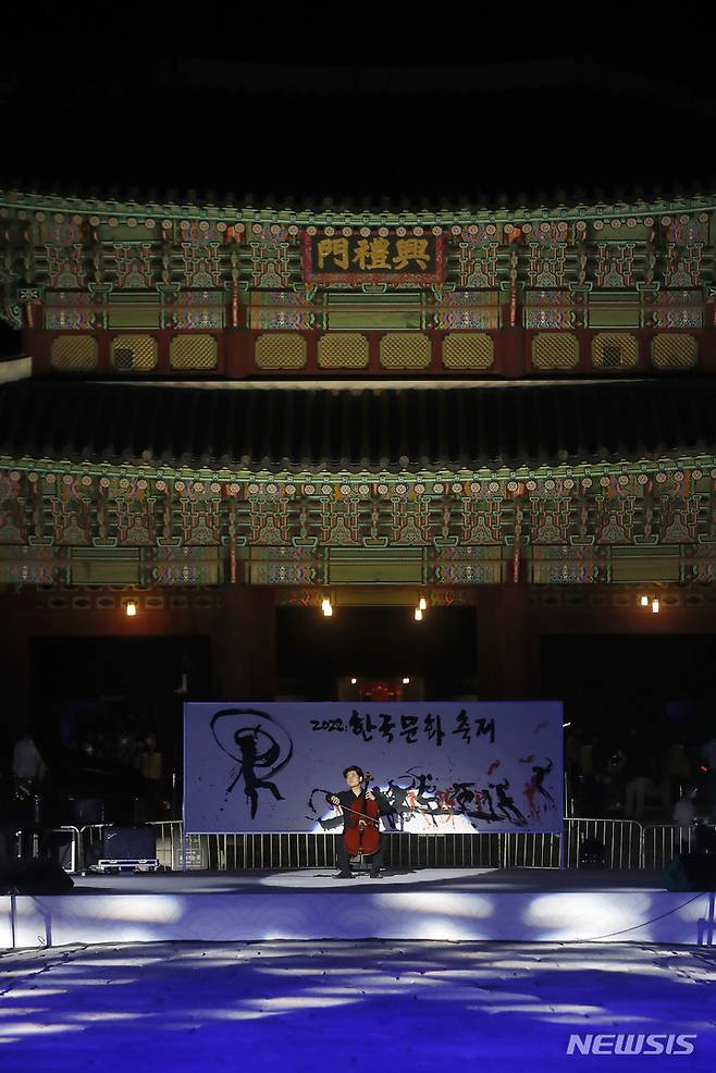 [서울=뉴시스] 최동준 기자 = 30일 서울 경복궁 홍례문 광장에서 2022 한국문화축제 전야제 공연이 열리고 있다. 2022.09.30. photocdj@newsis.com
