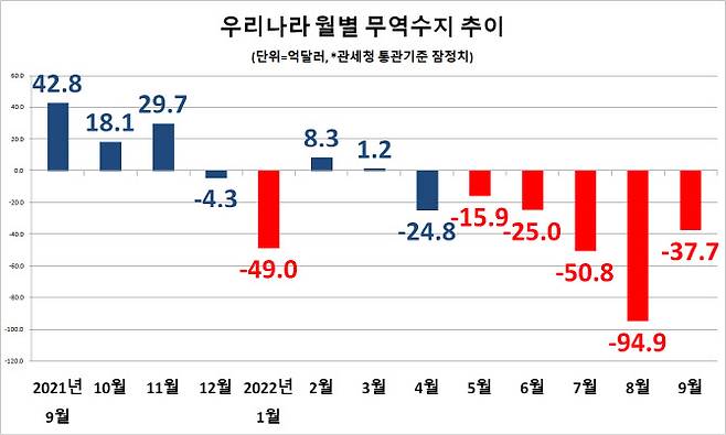 관세청과 산업통상자원부는 9월 수출입실적(통관기준) 잠정 집계 결과 수출액 575억달러, 수입액 612억달러로 무역수지가 38억달러 적자를 기록했다고 1일 밝혔다.