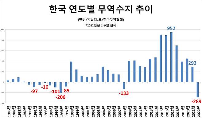 1~9월 누적 무역적자도 289억달러까지 치솟았다. 이미 1996년 기록한 사상 최대치 206억달러를 훌찍 뛰어넘었다. 전국경제인연합회가 지난달 말 15개 증권사 리서치센터장을 대상으로 조사한 올해 무역적자 전망 평균치(292억달러)의 턱밑에 이르렀다. 현 국제 에너지값 상황을 고려하면 연내 300억달러 돌파도 시간문제다.