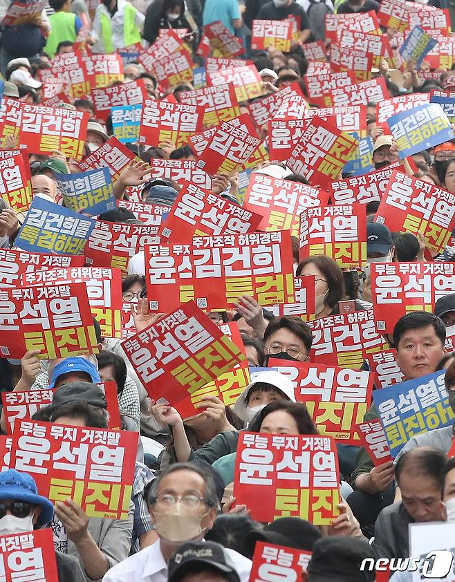 (서울=뉴스1) 임세영 기자 = 1일 오후 서울 중구 프레스센터 인근에서 열린 '김건희 특검 윤석열 퇴진 촛불대행진'에서 참석자들이 피켓을 들고 구호를 외치고 있다. 2022.10.1/뉴스1