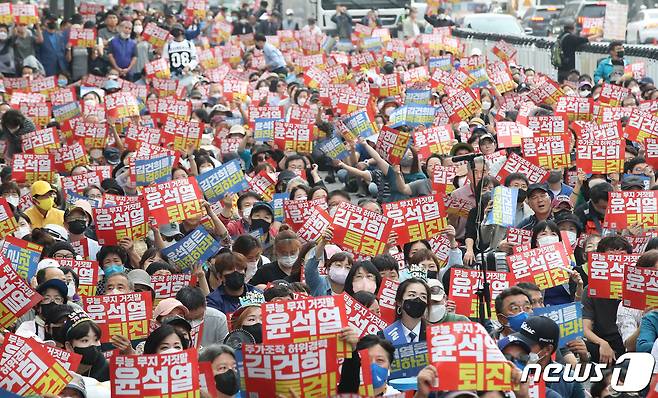 (서울=뉴스1) 임세영 기자 = 1일 오후 서울 중구 프레스센터 인근에서 열린 '김건희 특검 윤석열 퇴진 촛불대행진'에서 참석자들이 피켓을 들고 구호를 외치고 있다. 2022.10.1/뉴스1