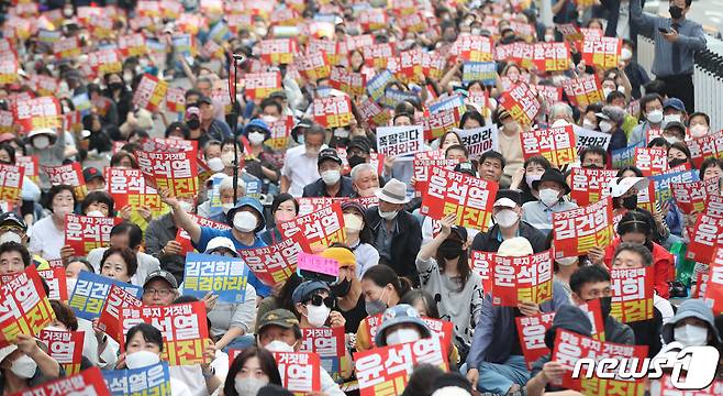 (서울=뉴스1) 임세영 기자 = 1일 오후 서울 중구 프레스센터 인근에서 열린 '김건희 특검 윤석열 퇴진 촛불대행진'에서 참석자들이 피켓을 들고 구호를 외치고 있다. 2022.10.1/뉴스1