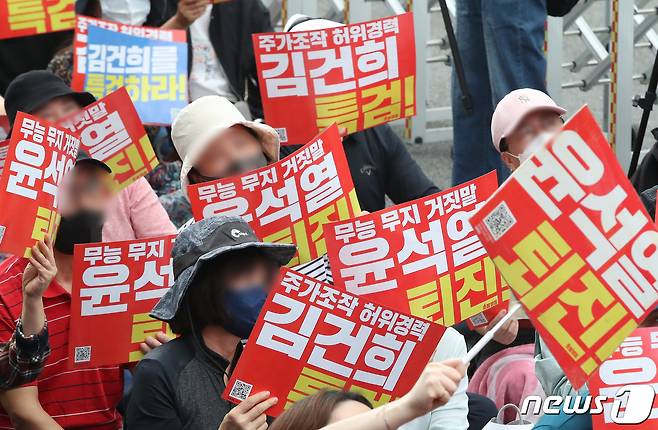 (서울=뉴스1) 임세영 기자 = 1일 오후 서울 중구 프레스센터 인근에서 열린 '김건희 특검 윤석열 퇴진 촛불대행진'에서 참석자들이 피켓을 들고 구호를 외치고 있다. 2022.10.1/뉴스1