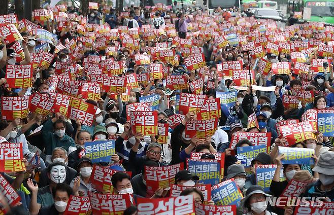 [서울=뉴시스] 조수정 기자 = 촛불전환행동 등 단체 회원들이 1일 오후 서울 세종대로에서 정권 비판 집회를 하고 있다. 2022.10.01. chocrystal@newsis.com