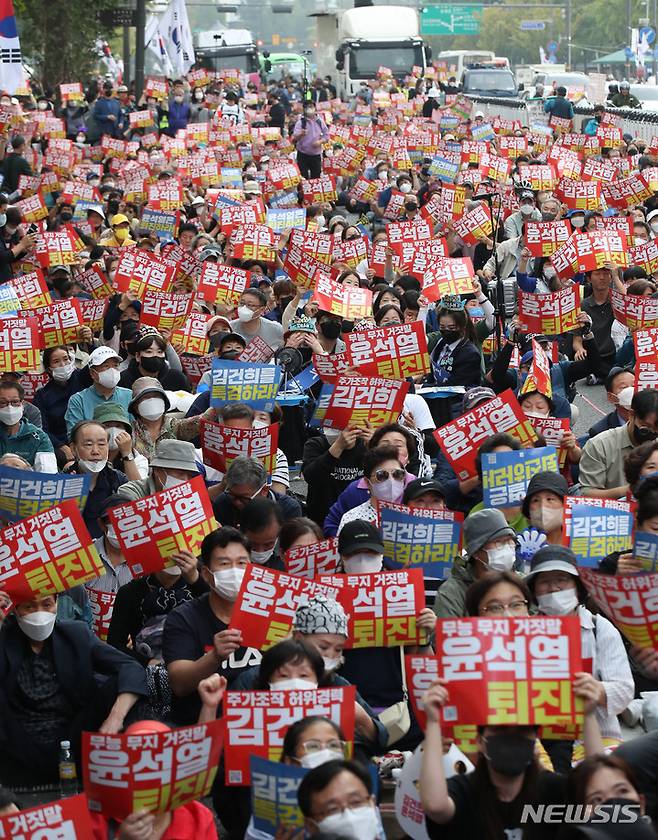 [서울=뉴시스] 조수정 기자 = 촛불전환행동 등 단체 회원들이 1일 오후 서울 세종대로에서 정권 비판 집회를 하고 있다. 2022.10.01. chocrystal@newsis.com