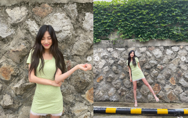 공개된 사진 속 오하영은 산뜻한 컬러의 미니드레스를 입고 담벼락에 서 자유로운 포즈를 즐겼다.