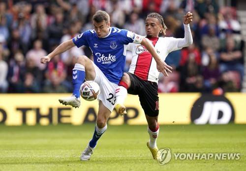 Everton's Seamus Coleman, left, and Southampton's Sekou Mara battle for the ball during their English Premier League soccer match at St. Mary's Stadium, Southampton, England, Saturday, Oct. 1, 2022. (Andrew Matthews/PA via AP) UNITED KINGDOM OUT; NO SALES; NO ARCHIVE; PHOTOGRAPH MAY NOT BE STORED OR USED FOR MORE THAN 14 DAYS AFTER THE DAY OF TRANSMISSION; MANDATORY CREDIT