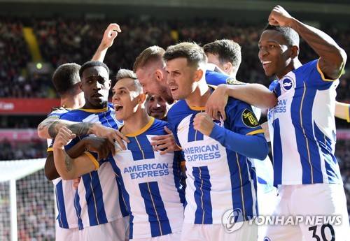 epa10217757 Leandro Trossard (3-L) of Brighton celebrates with teammates after scoring the 1-0 lead during the English Premier League soccer match between Liverpool FC and Brighton and Hove Albion in Liverpool, Britain, 01 October 2022. EPA/PETER POWELL EDITORIAL USE ONLY. No use with unauthorized audio, video, data, fixture lists, club/league logos or 'live' services. Online in-match use limited to 120 images, no video emulation. No use in betting, games or single club/league/player publications