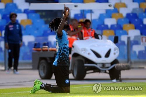 epa10217760 Napoli's midfielder Andre Anguissa celebrates scoring a goal during the Italian Serie A soccer match between SSC Napoli and Torino FC at 'Diego Armando Maradona' stadium in Naples, Italy, 01 October 2022 EPA/CESARE ABBATE