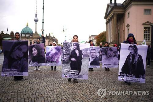 epa10217823 Protesters carries poster with portraits of victims, among them Mahsa Amini (C), during a 'Solidarity with the civil uprising in Iran' rally at Bebel Platz square in Berlin, Germany, 01 October 2022. Protests have erupted in Iran and across the world after the death of Mahsa Amini who died in the custody of Iran's morality police. EPA/CLEMENS BILAN