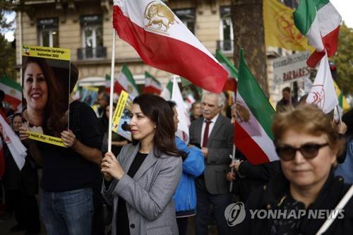 epa10217831 Hundreds of Iranians protest during a demonstration in support of Mahsa Amini near the Iranian Embassy in Paris, France, 01 October 2022. The Iranian community residing in France protested against the internet cuts and the Iranian government's repression following the wave of protests over the death of Mahsa Amini, who died after she was arrested by the Iranian morality police. EPA/YOAN VALAT