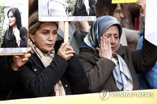 epa10217835 Hundreds of Iranians protest during a demonstration in support of Mahsa Amini near the Iranian Embassy in Paris, France, 01 October 2022. The Iranian community residing in France protested against the internet cuts and the Iranian government's repression following the wave of protests over the death of Mahsa Amini, who died after she was arrested by the Iranian morality police. EPA/YOAN VALAT