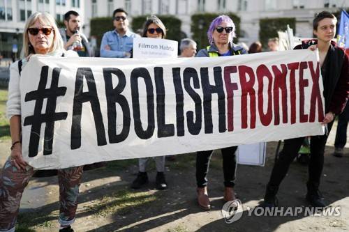 epa10217850 People with a banner 'Abolish frontex' take part in the 'Rights, no death' march protest to support migrants, in Brussels, Belgium, 01 October 2022. This march is to denounce the EU as being responsible as thousands of forced migrants die when trying to reach Europe or trying to cross its internal borders. EPA/JULIEN WARNAND