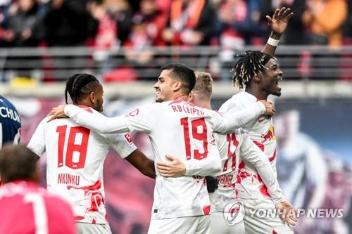 epa10217858 Leipzig players celebrate their 3-0 lead during the German Bundesliga soccer match between RB Leipzig and VfL Bochum in Leipzig, Germany, 01 October 2022. EPA/FILIP SINGER CONDITIONS - ATTENTION: The DFL regulations prohibit any use of photographs as image sequences and/or quasi-video.