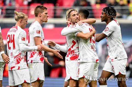 epa10217859 Leipzig players celebrate their 3-0 lead during the German Bundesliga soccer match between RB Leipzig and VfL Bochum in Leipzig, Germany, 01 October 2022. EPA/FILIP SINGER CONDITIONS - ATTENTION: The DFL regulations prohibit any use of photographs as image sequences and/or quasi-video.